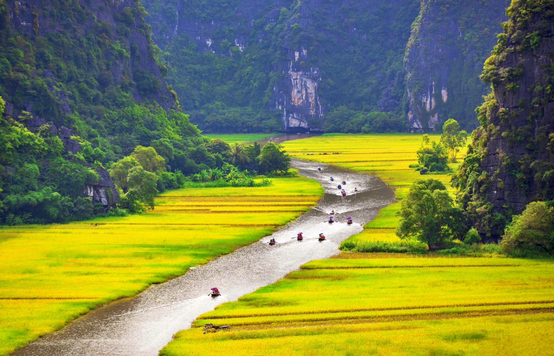 Lunch is in a local town around Nho Quan, where we enjoy simple Vietnamese dishes and refresh with cold drinks. After lunch, the landscape slowly transforms into the famous karst scenery of Ninh Binh – often called “Halong Bay on land”. Towering limestone mountains rise straight from rice paddies and rivers, creating a stunning panorama as we approach Tam Coc.